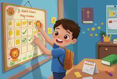 A criança marca seu progresso no quadro de hábitos (check, adesivo ou coroa do dia)