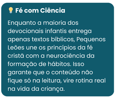 Pequenos Leões é mais do que um plano devocional. É um convite para plantar sementes eternas no coração do seu filho, usando um método leve, envolvente e profundamente transformador.