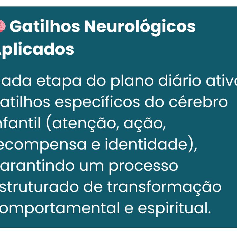 🧠 Esse ato de verbalizar cria um reforço neural da identidade. O cérebro da criança começa a associar a verdade bíblica ao “quem ela é”.